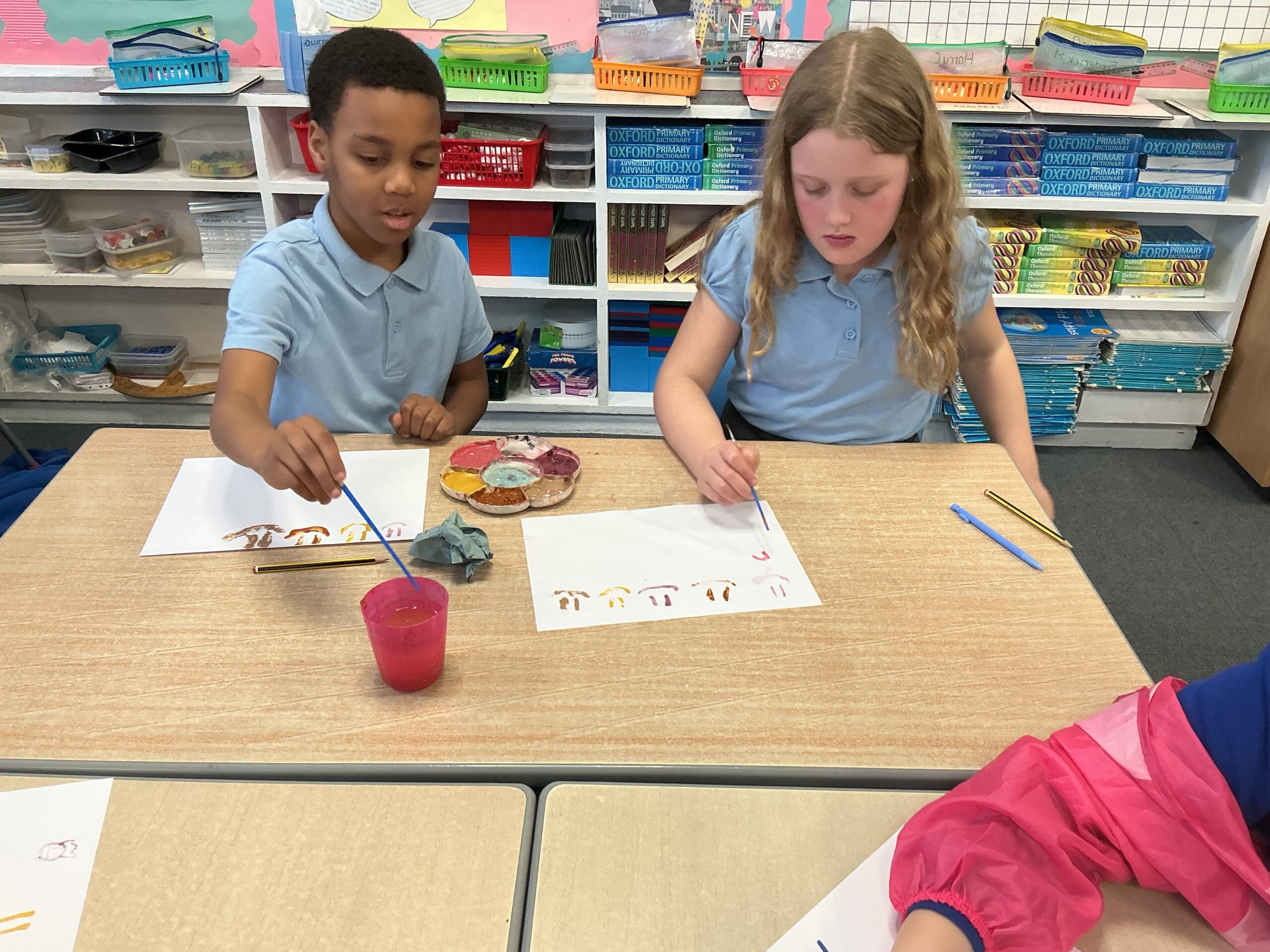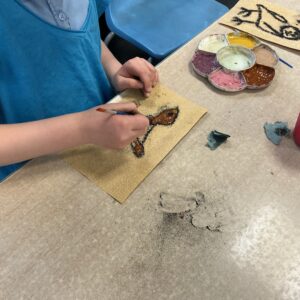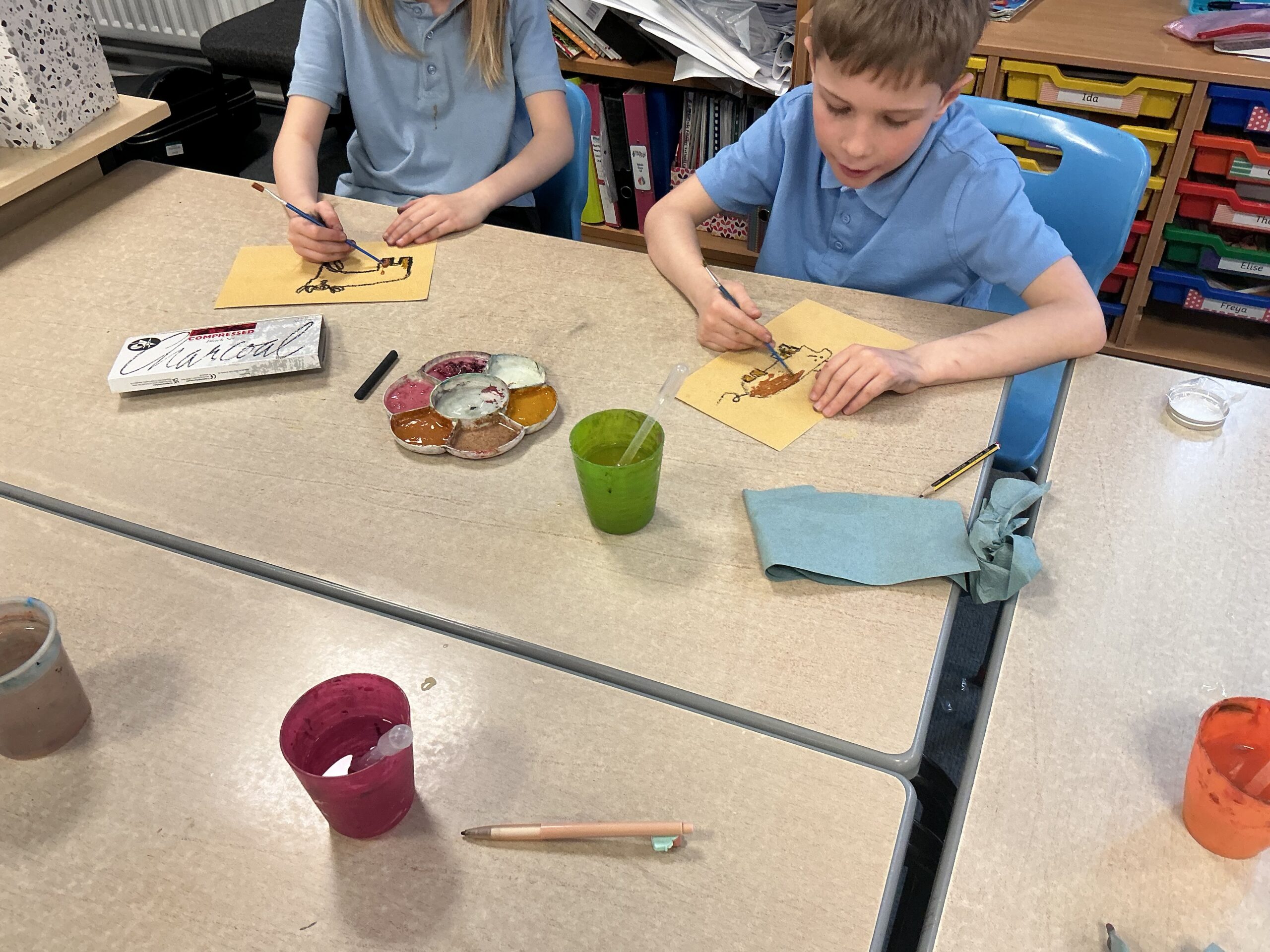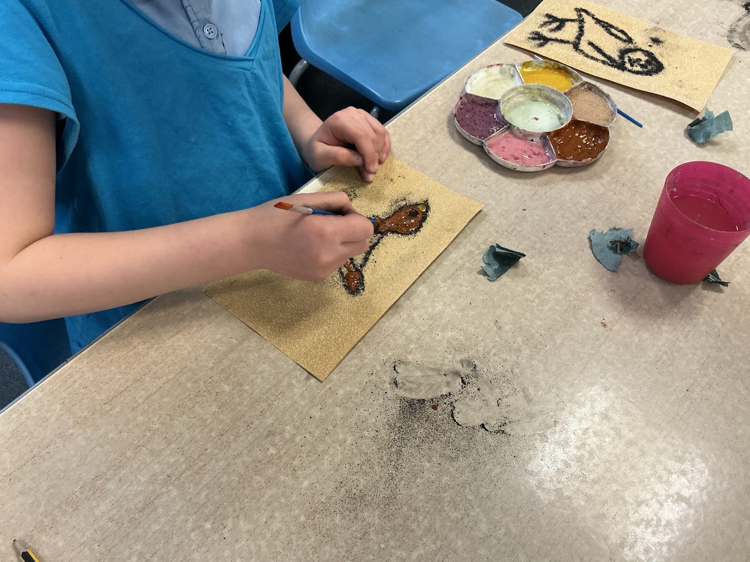 Finally, we drew some British animals on sand paper using charcoal. We chose animals as during prehistoric times people drew lots of animals because they were a very important aspect of their lives. The sand paper provided a rough texture like the walls of a cave they would have drawn on in prehistoric times. To complete them, we painted using the lovely colours we made earlier in the lesson.