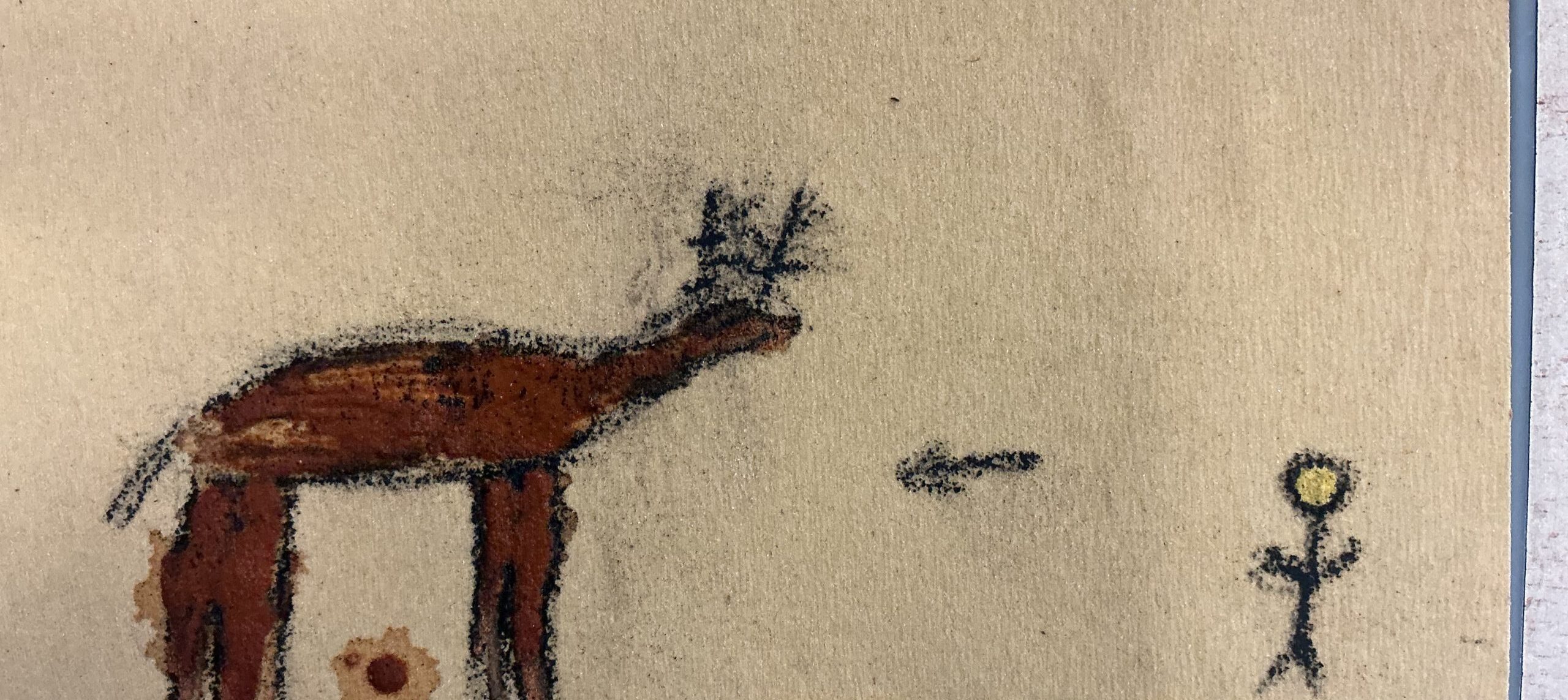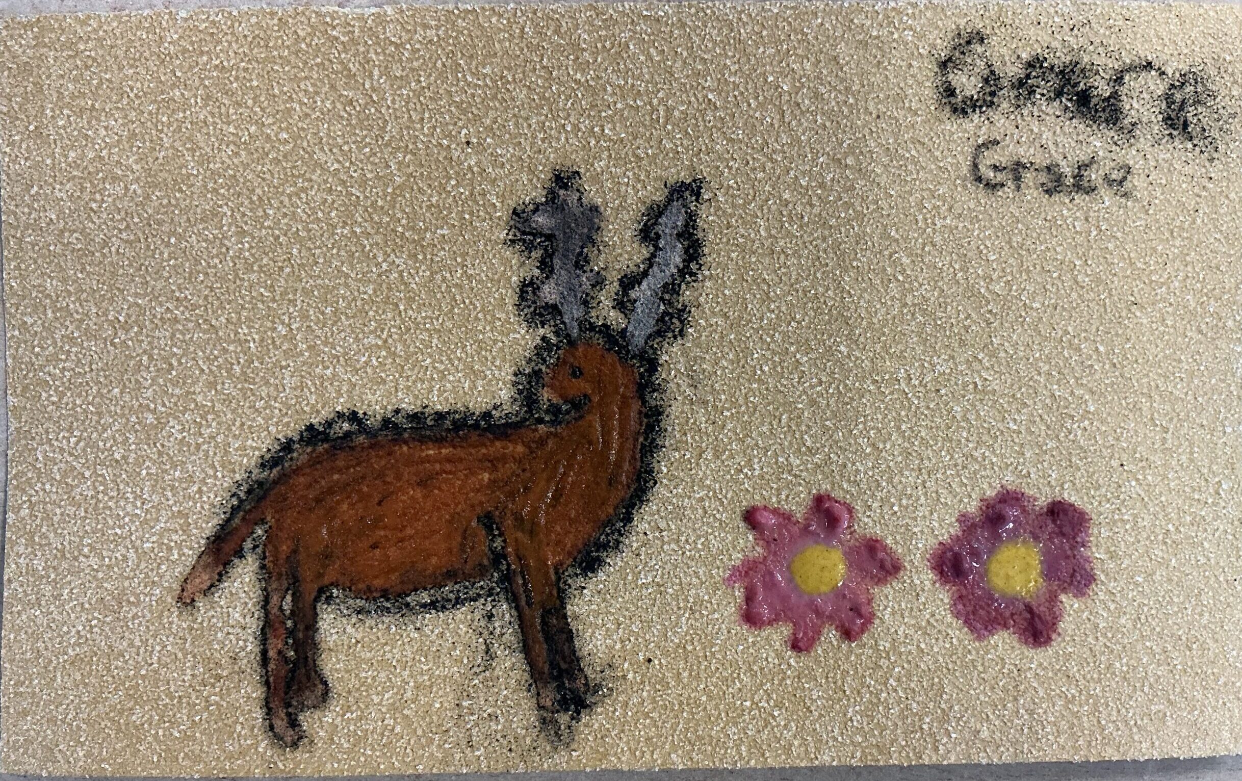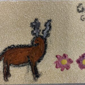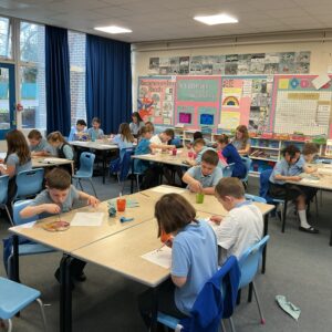 Finally, we drew some British animals on sand paper using charcoal. We chose animals as during prehistoric times people drew lots of animals because they were a very important aspect of their lives. The sand paper provided a rough texture like the walls of a cave they would have drawn on in prehistoric times. To complete them, we painted using the lovely colours we made earlier in the lesson.