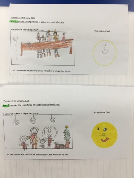 The children also explored how these ideas can support their own wellbeing. The children shared moments when they have felt thankful, praised others, or remembered special celebrations, recognising how these actions help them feel positive and connected to their community.